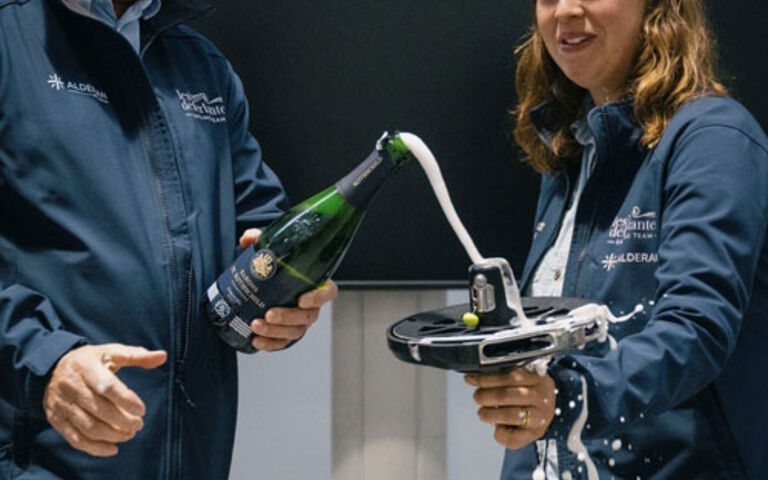 Faute de pouvoir sabrer le champagne directement sur le bateau (une coutume que les architectes doivent par ailleurs observer d’un œil sceptique !), les skippeuses ont opté pour une alternative aussi ingénieuse que symbolique : baptiser l’emmagasineur Profurl NEX2.5.